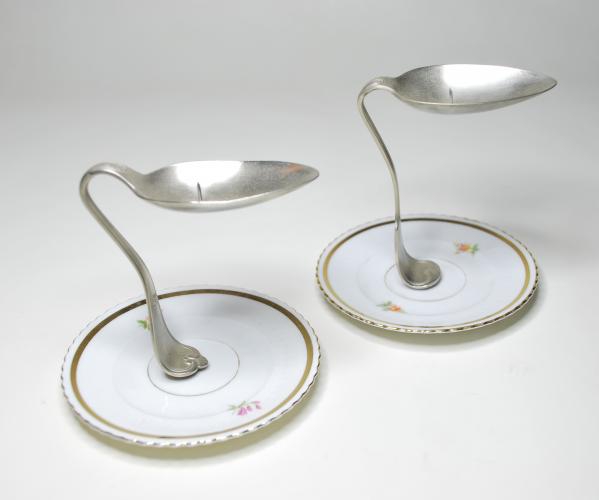 Candelabro realizzato con vecchi piattini in porcellana e posate in alpacca.